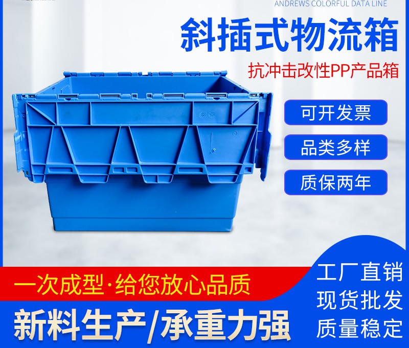 斜插式周转箱:改性PP材质,防潮、耐用、易清洗,空箱可互相插入堆放,节省空间,有效减少运输成本,常用于物流配送过程,特别适合烟草、图书等行业使用,满载时可堆垛四层,广泛适用于商业流通、配送及仓储领域。可机械化搬运,实现了流通合理化,提高了工作效率,便于管理。