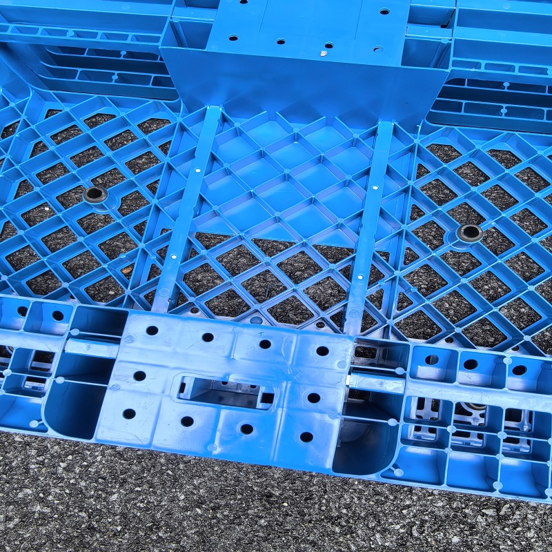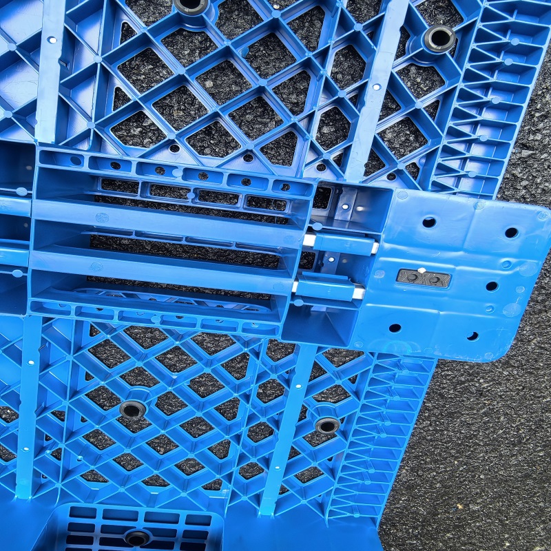 底部结构:反川托盘的底部同样呈现“川”字形,由三条主梁平行排列形成稳固的支撑结构,但进叉方向与正向托盘相反。
